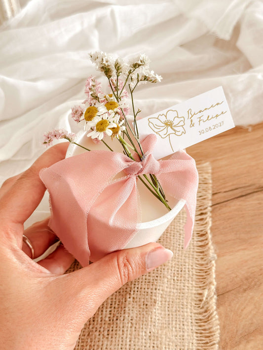 Vela Personalizada para Lembrança de Casamento, Batizado e Eventos | Copo de Cerâmica Branco Fita Rosa | A partir de 7,43€