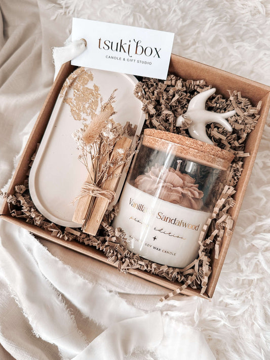 Serenity Box | Caixa Presente com Vela Livros Branca, Base de Madeira e Pau Santo Floral | Tsuki Signature Boxes