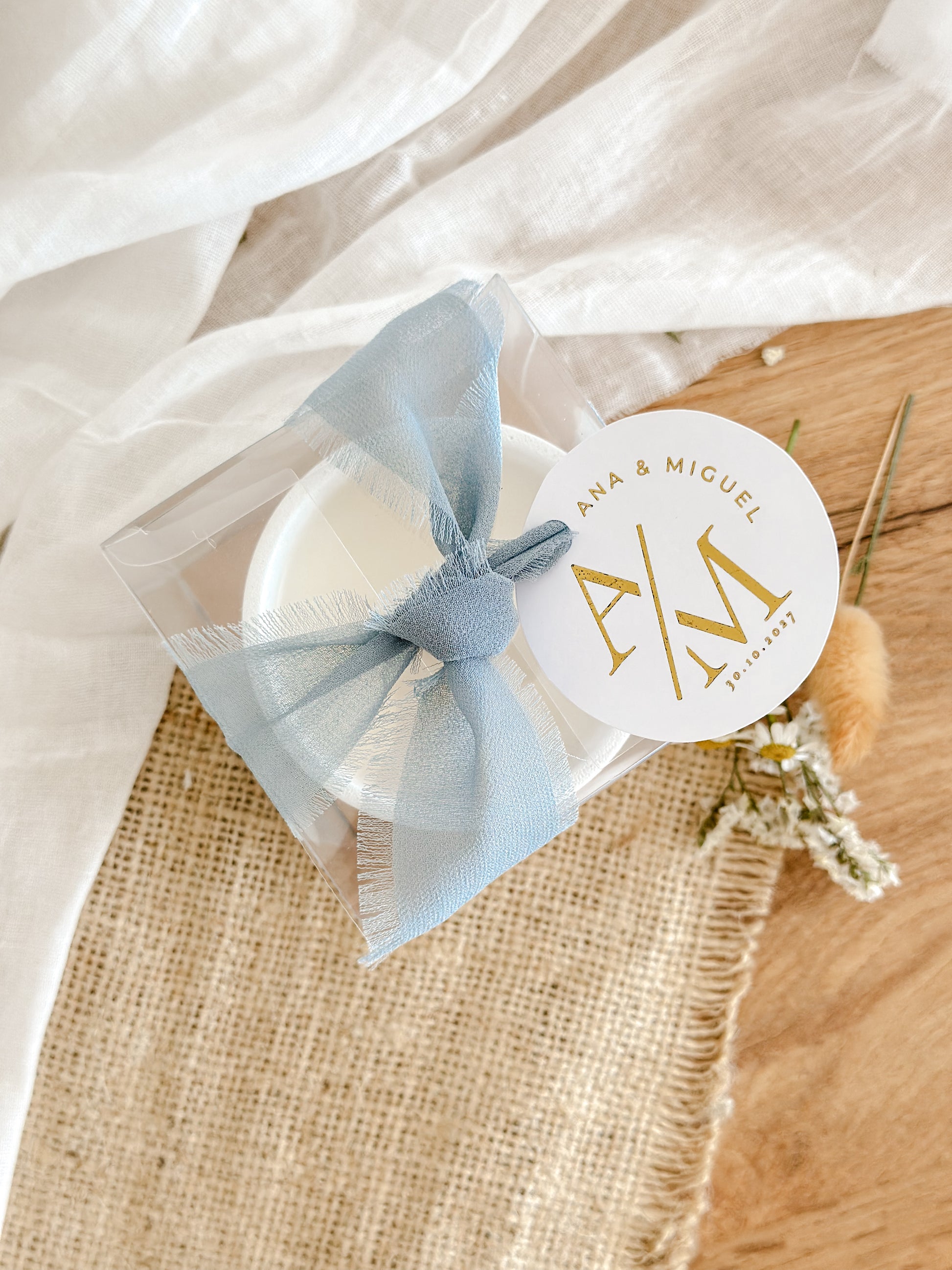 Customized Candle for Wedding, Baptism, and Events | White Ceramic Cup Blue Ribbon | Starting from 7.43€