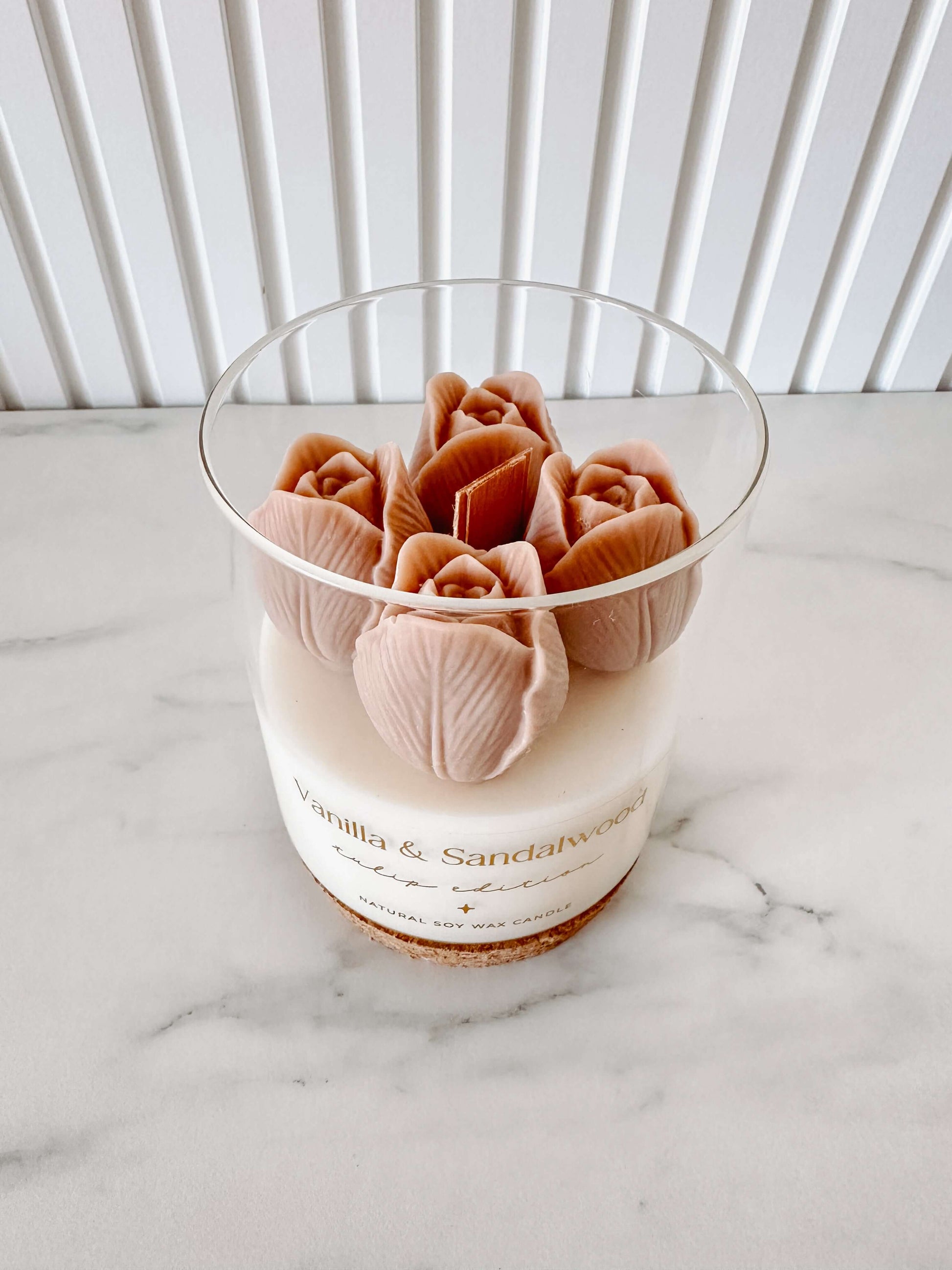 Com 400g de cera de soja natural, apresentada em pote de vidro com tampa de cortiça, esta peça é decorada com tulipas bege em cera moldada, símbolo de pureza e harmonia.