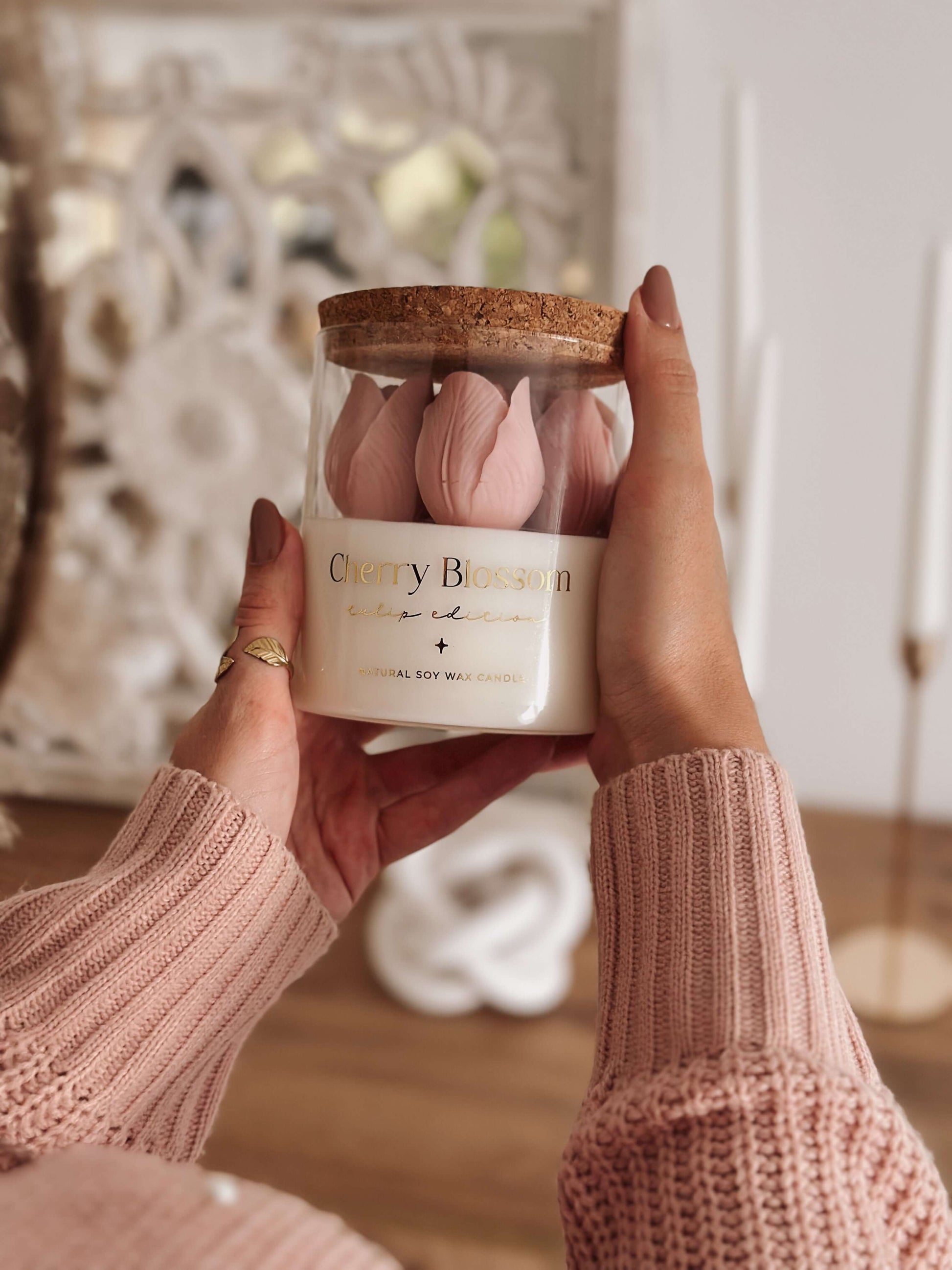 Uma peça perfumada e decorativa que celebra a delicadeza das tulipas rosa e o perfume suave do Cherry Blossom, como um jardim de primavera que floresce dentro de casa.